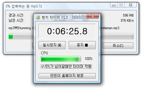 -  압축프로그램을 제외한 모든 프로그램의 작동을 중지시켜서 반드시 CPU 점유율이 5%이하(0~1%)를 유지하도록 준비한다.