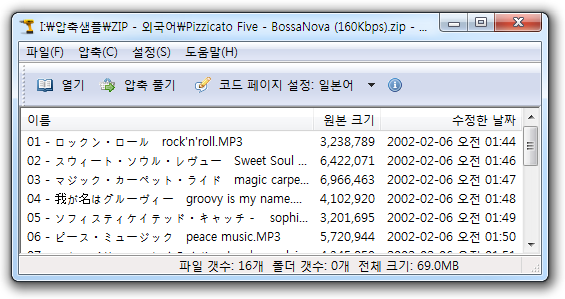 (이미지 설명: 일본어로 압축된 ZIP 파일을 코드페이지 설정을 이용해 글자를 깨지지 않고 보여주는 모습)